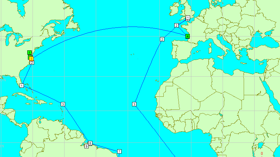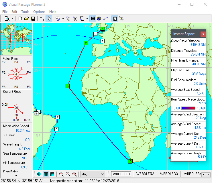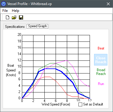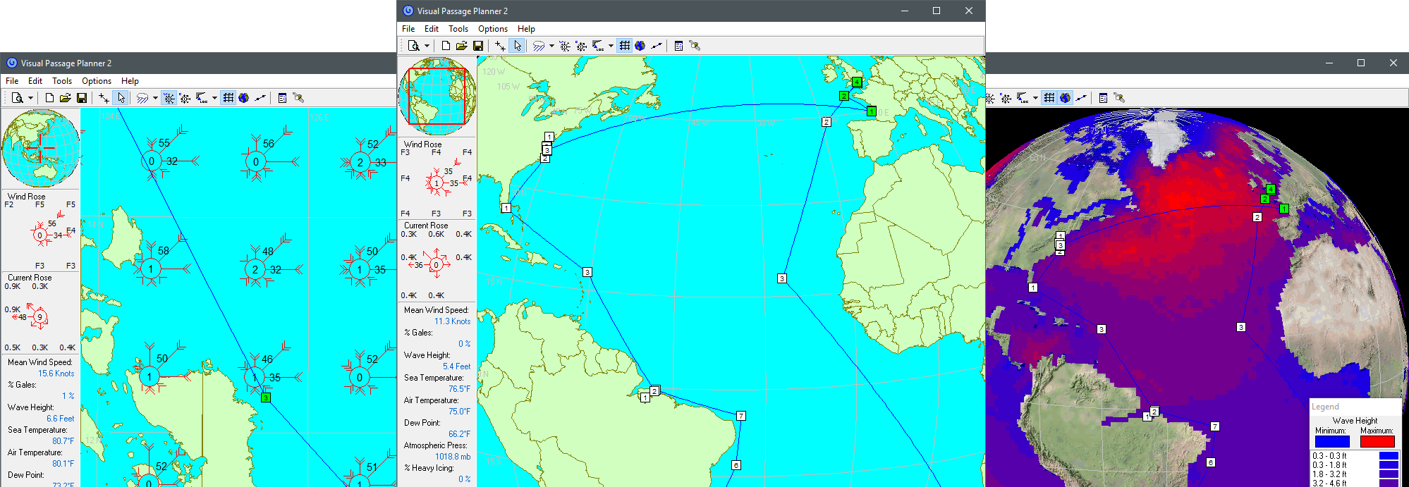 A straight line is not always the best route between two waypoints across an ocean. Wind direction, currents, and vessel speed characteristics can combine to make the fastest route different than the rhumbline course. Also, the fastest route may not be the preferred route due to unacceptable wave heights or the desire to remain in warmer water temperatures. If you plan your route with a minimum of widely spaced waypoints, VPP2 can automatically generate a set of intermediate waypoints indicating a potentially faster/safer/warmer/etc. route for your vessel.