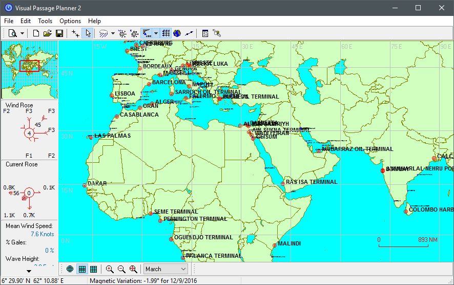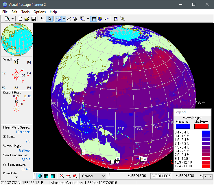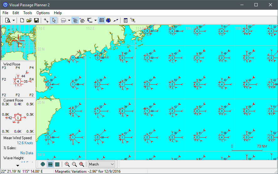 The official NOAA pilot chart data was used in the development of VPP2. It includes more than one hundred years of world wide weather observations at both 1-degree and 5-degree resolution. The data includes. Wind Roses, Current Roses, Mean Wind Speeds, % Gales, Wave Heights, Sea/Air Temperatures, Dew Points, Atmospheric Pressures, and Icing. Data for the entire world (75°N Lat. to 75°S Lat) for all 12 months is included.